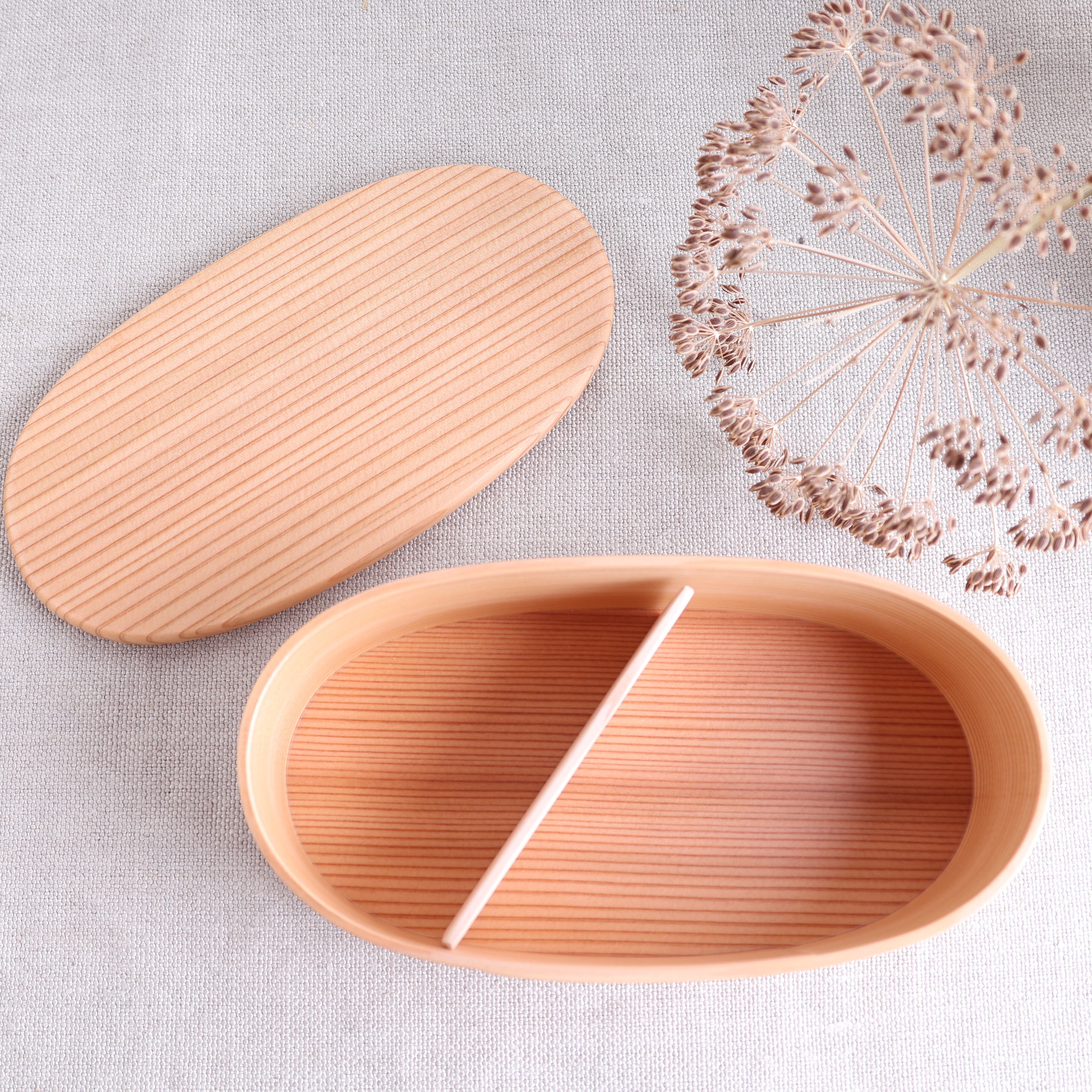 秋田杉の魅力を味わえる、いろは弁当箱。木の温かみが感じられる手触りと、美しい木目が特徴です。日本の伝統的な弁当を楽しんでみてはいかがでしょうか。通常のものよりも少しスリムな形が特徴です。本来細く曲げることが難しいわっぱの制作において、持ち運びに便利なようにと、配慮されています。お弁当タイムを特別なひとときにしてくれます。