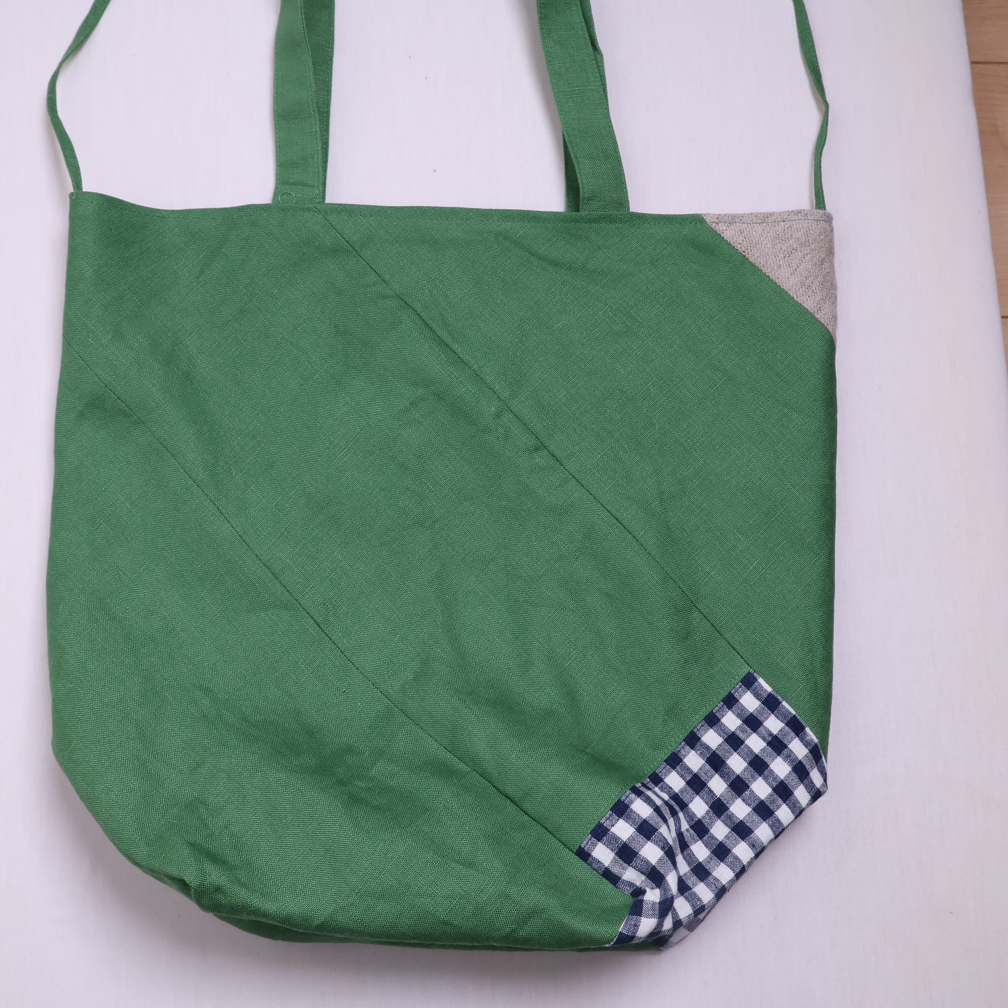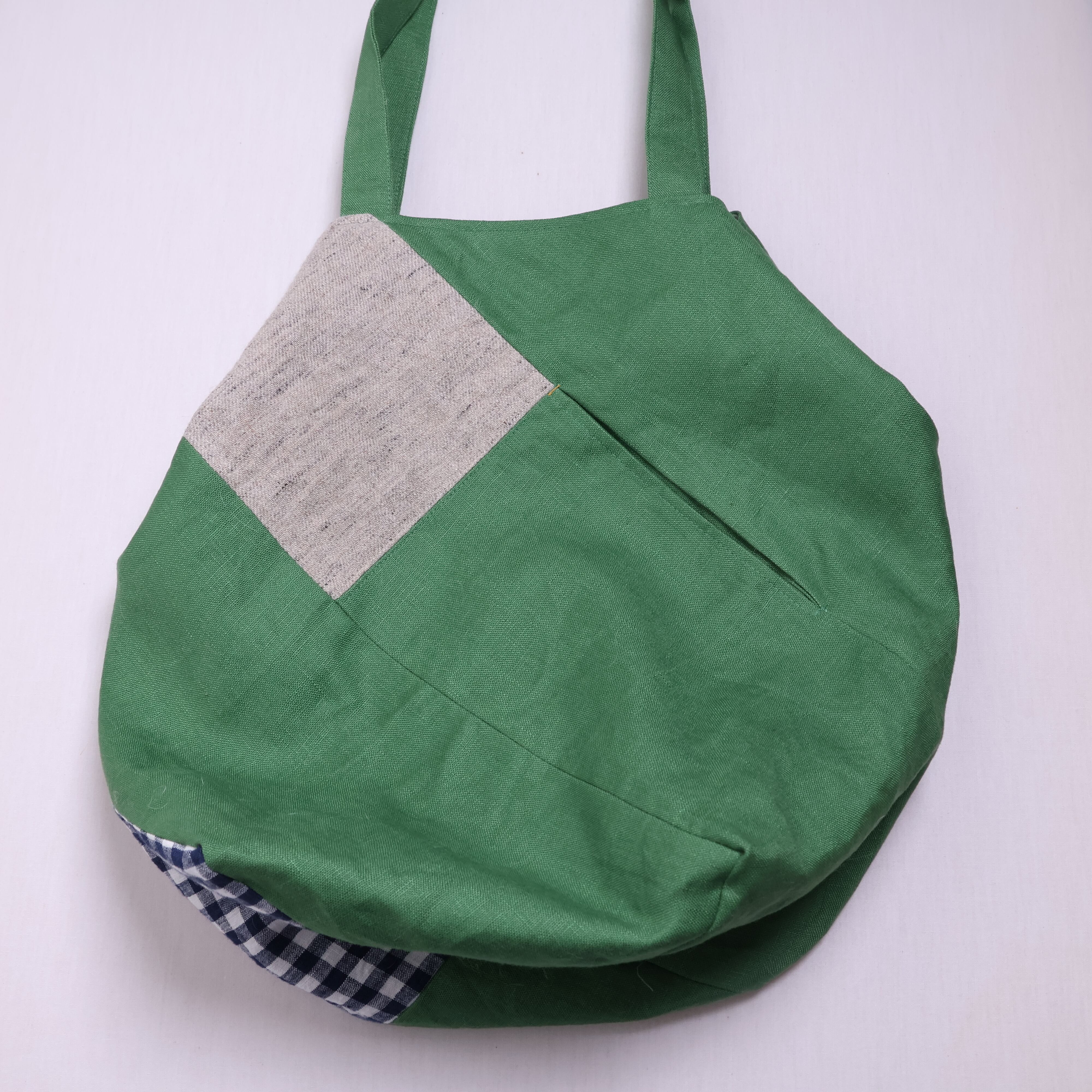 おしゃれで便利なお手玉バッグ登場!軽い布素材で作られたこのバッグは、表にとても綺麗なリーフグリーンのリネン生地を使用、薄いグレーとチェック柄の上質なリネン生地を組み合わせており、個性的の光るデザインが特徴です。外側、内側にはポケットも付いているので、小物の整理もバッチリです。さらに、両脇上部の紐を結ぶと六角形の形になり、形にも個性が光ります。