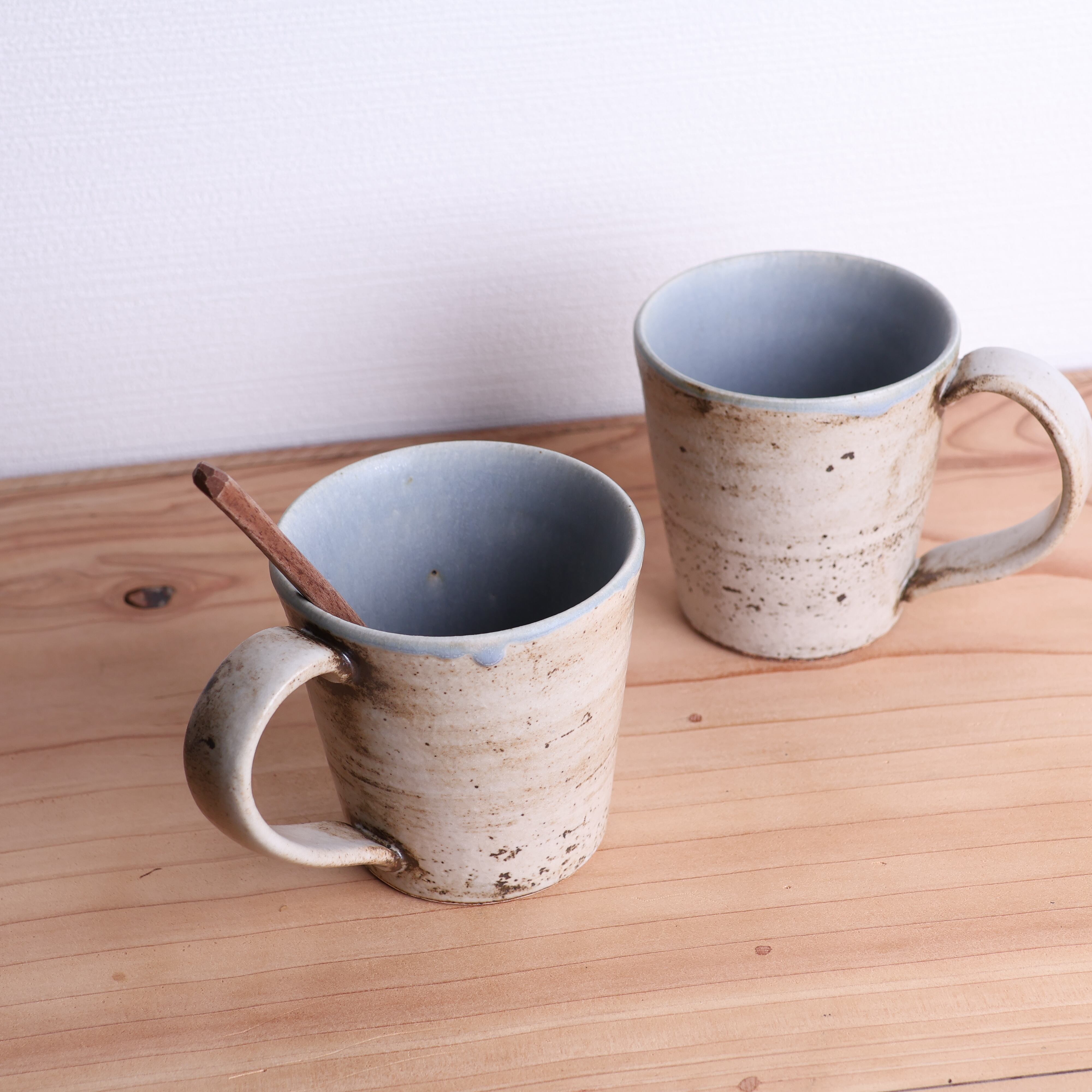 外側は味のあるマットな白、内側が関さんの器の大きな特徴の一つである"蒼”のマグカップです。