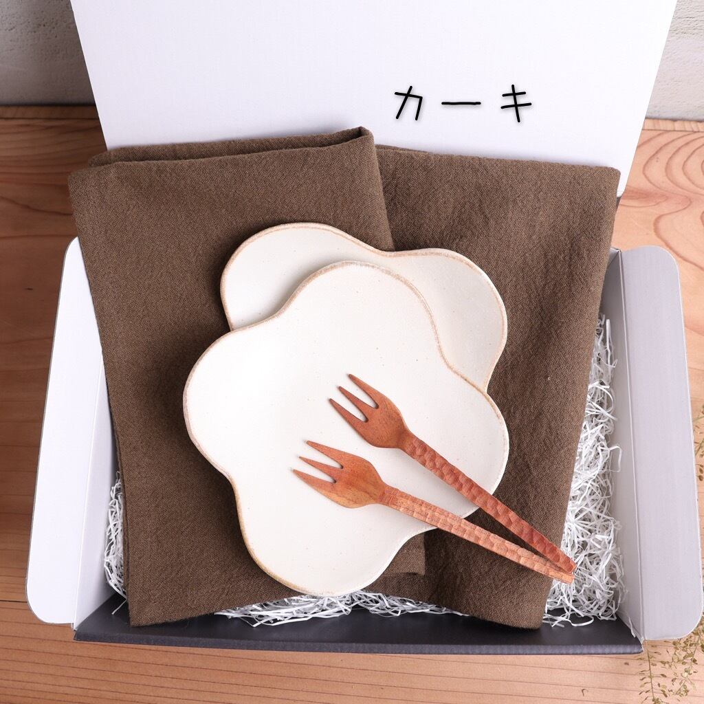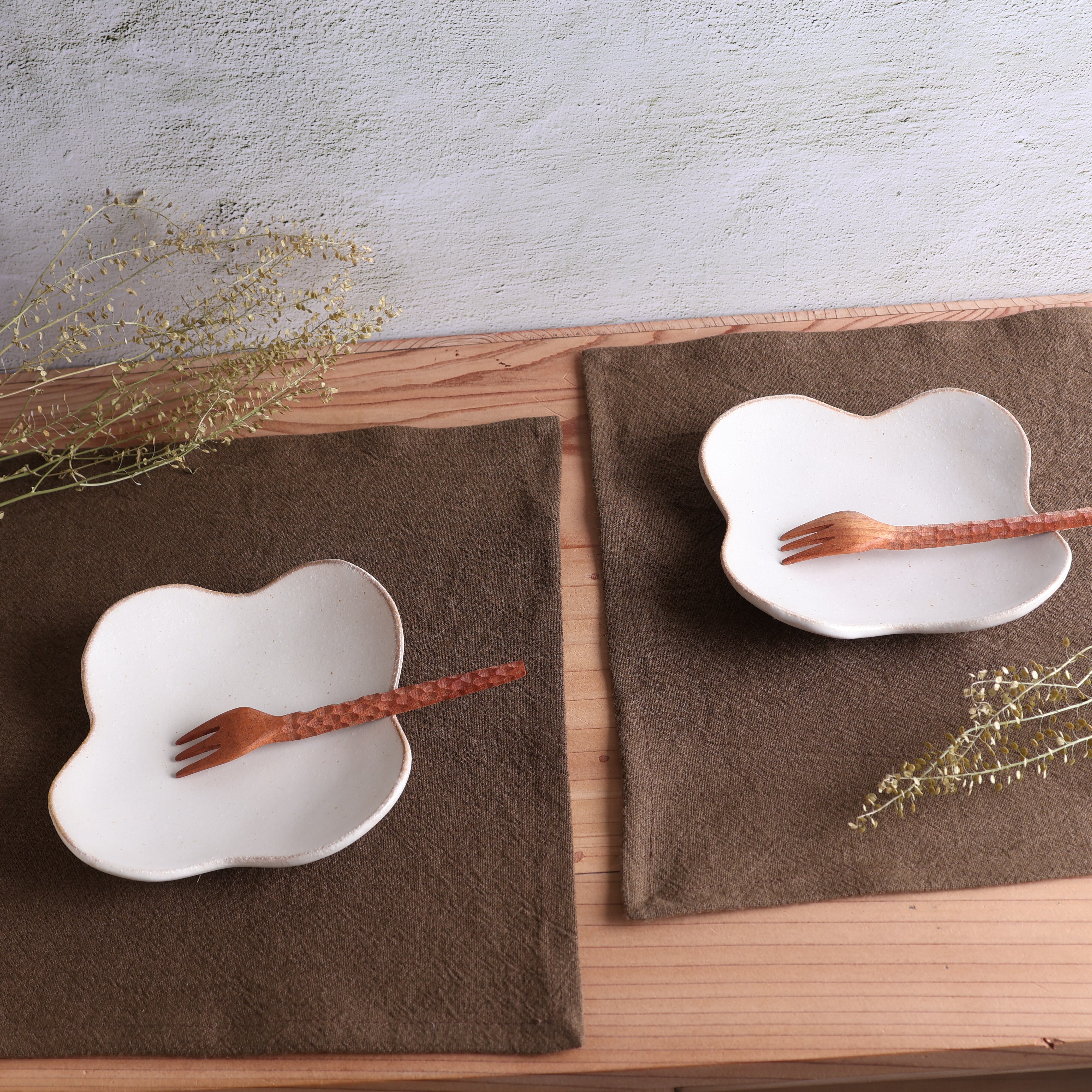 若林健吾(わかさま陶芸)さんのかわいい花形小皿と、フェアトレードのニームフォーク、楽布アオトソラ手作りリネンのランチョンマットのペアギフトセットです。