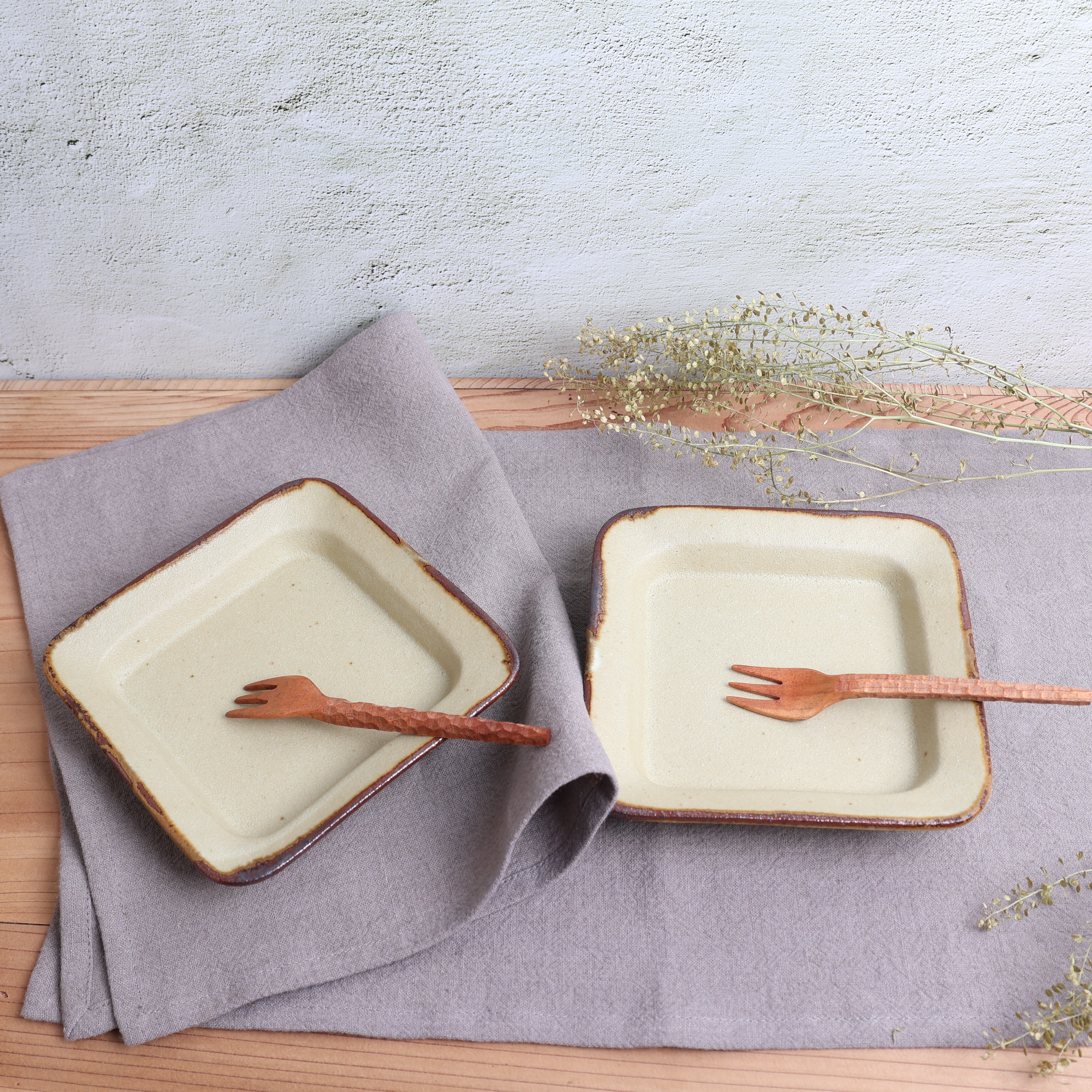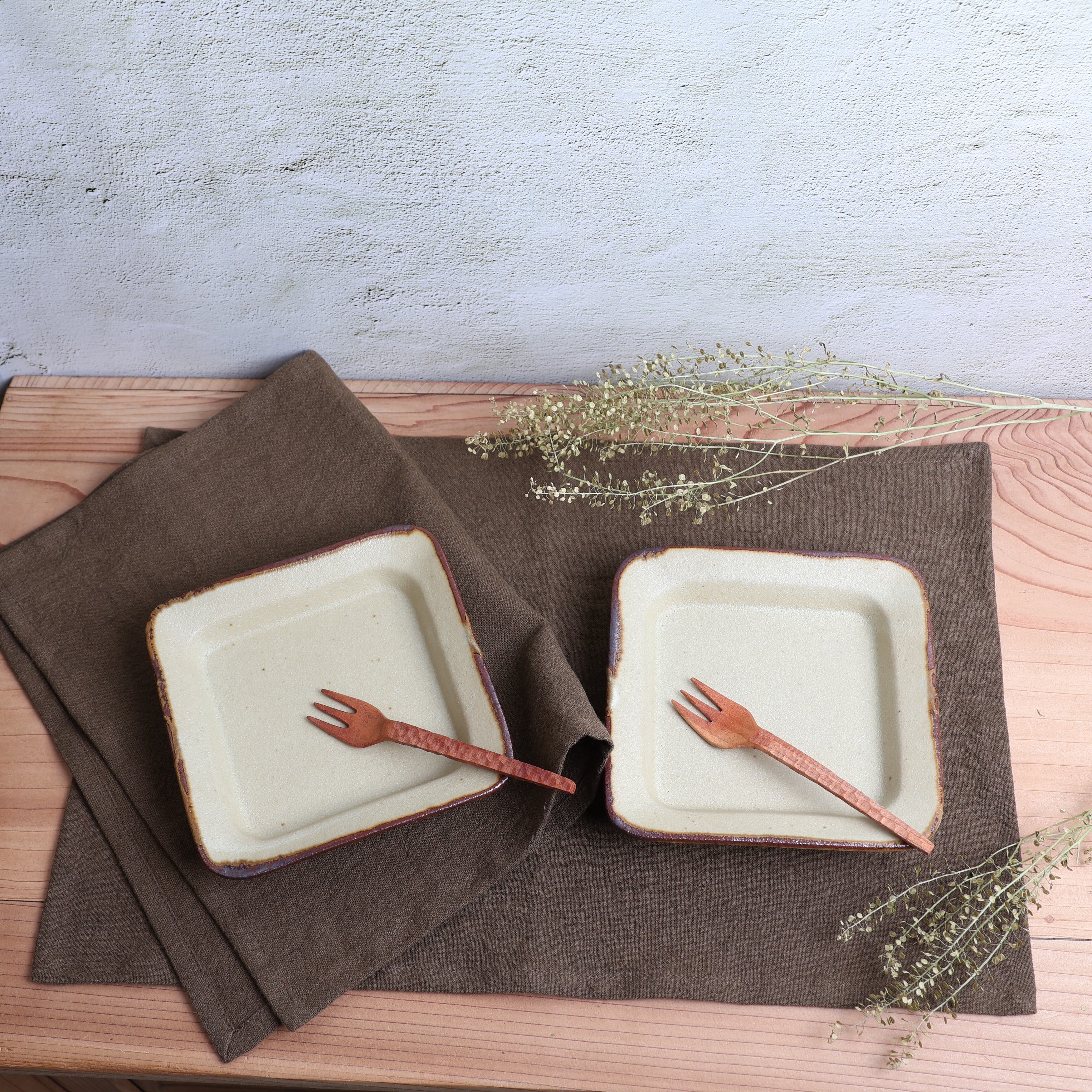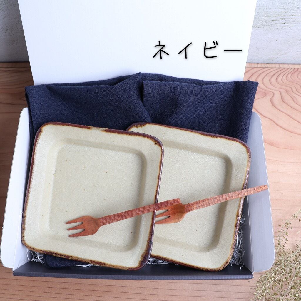 折笠秀樹さんの素朴で使いやすい、四方リム皿と、フェアトレードのニームフォーク、楽布アオトソラ手作りリネンのランチョンマットのペアギフトセットです。